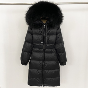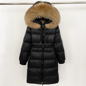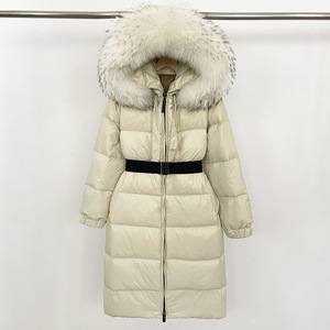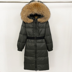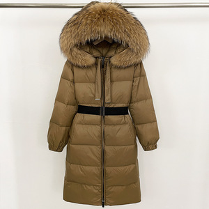 冬の大きなファー襟フード付きロングダウンジャケット女性用、高級ホワイトダックダウンジャケット、多用途で暖かい膝丈ジャケット