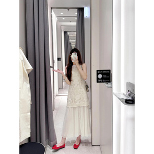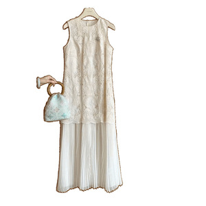 フレンチレトロな優しいスタイルのヘビーデューティー中空かぎ針編みフェイクツーピースプリーツノースリーブベストドレスフェミニンロングスカート