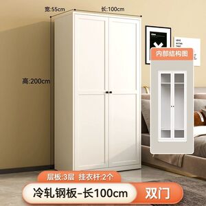 両開きドアワードローブ - 幅1.0mの鉄製ドア、スチールキャビネット、ウォームホワイト、ホルムアルデヒドフリー + 2ドア + 組み立て済み