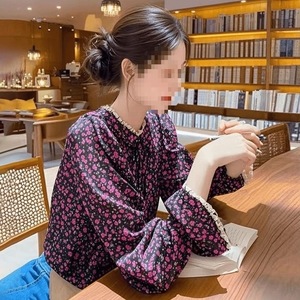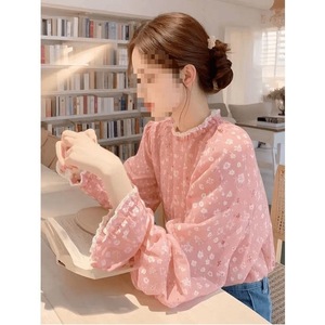 2025春の新作ハイカラーシャツ、見栄えが良く美しいデザイン、小さなフレッシュピンクの花柄パフスリーブシャツ