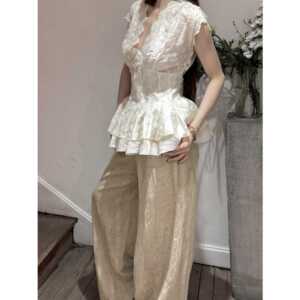 夏のフレンチスタイルのスーツ、美しくユニークで高級感のあるレースのトップス、ゆったりとしたワイドレッグのパンツ