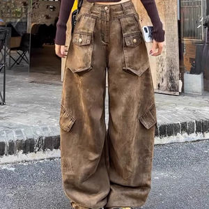 アメリカンレトロな大きいサイズのブラウンオーバーオール女性の秋冬の新しいホットガールヘビーデューティーマルチポケットシミターフロアモップパンツ