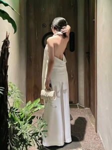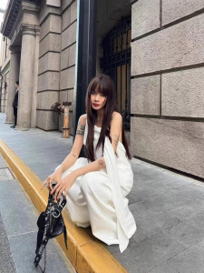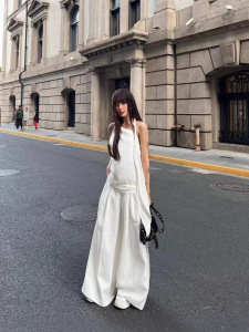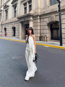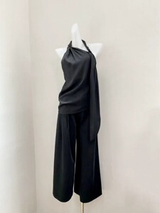 ミニマリストで静かなラグジュアリースタイル 25ss ツイストロープ 斜め襟 ホルターネック バックレス イレギュラーウエスト サスペンダー ハイウエスト ワイドレッグ パンツ ロングスーツ