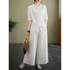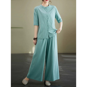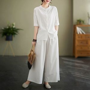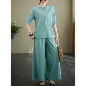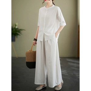 女性用ラミースーツ 2025 夏ラウンドネック薄手シャツファッショナブルなルーズスリムワイドレッグパンツ綿とリネンの 2 点セット