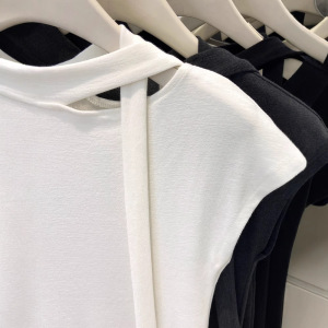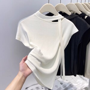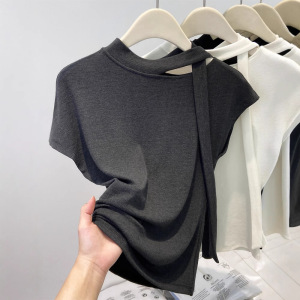 リボン付き白半袖Tシャツレディース夏新作ニッチデザイン右肩スリム無地シャツトップTシャツ