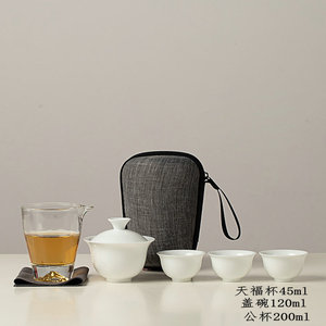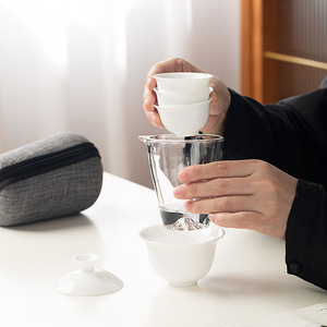 徳化白磁旅行用功夫茶セット、蓋付きボウル、ガラス製急須、携帯用バッグ、中秋節のお土産ギフト、ロゴ入り