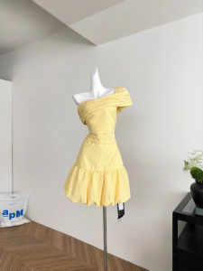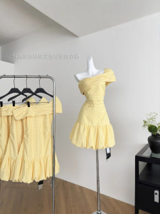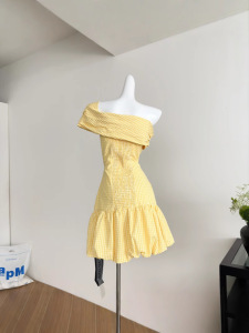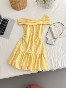Soote Season オリジナル オフショルダー イエロー チェック柄 立体花びら テクスチャー Aライン ウエストゴムワンピース