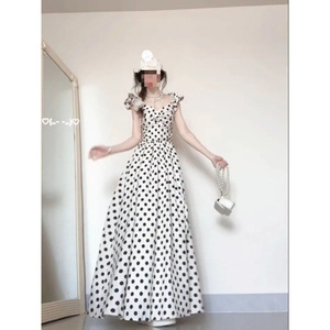 高级感气质波点高个子加长连衣裙夏季新款褶皱收腰显瘦法式大摆裙
