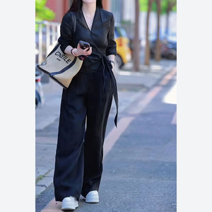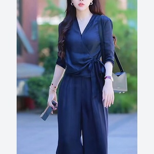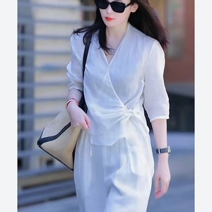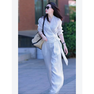 ヨーロッパとアメリカの国境を越えた貿易ハイエンドカジュアル痩身ファッションスーツ女性の薄いリネン通気性ワイドレッグパンツ 2 点セット