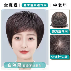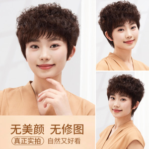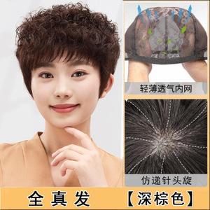 真发假发女全真人发丝头套自然遮白发中老年假发套整顶短卷发头套