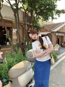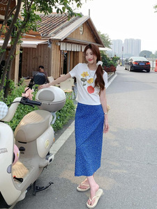 度假风韩系套装女夏季2025新款白色印花T恤高腰碎花半身裙两件套