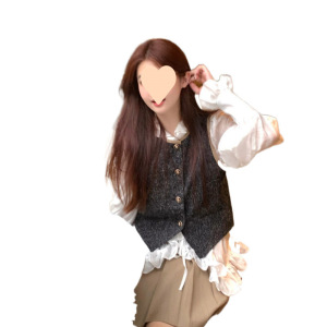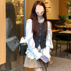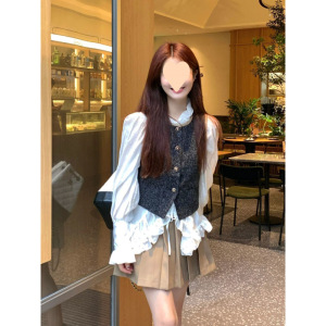 韩系复古气质小香风无袖马甲背心叠穿长袖衬衫百褶短裙秋季三件套