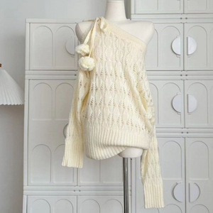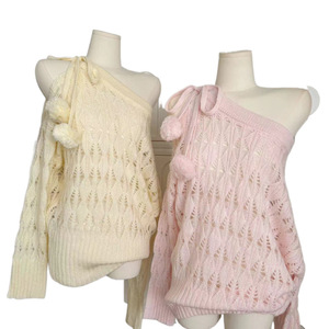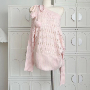 春秋季宽松针织衫长袖针织绑带露肩设计镂空新款套头毛衣毛衣上衣