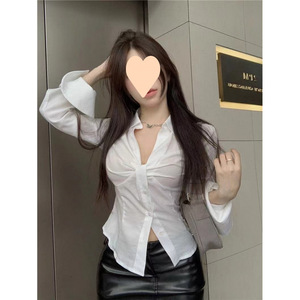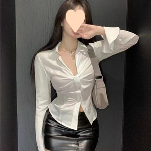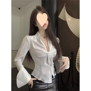 白色辣妹领扭结长袖衬衫女夏法式别致衬衣短款褶皱小众收腰上衣