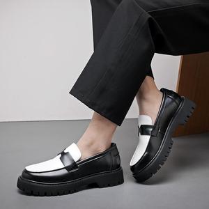 跨境2025新款英伦风男士黑白拼色皮鞋小个子增高懒人套脚厚底皮鞋