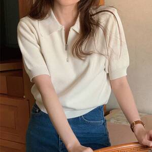 领针织衫短袖恤女夏薄款拉链翻领潮韩版别致洋气短款上衣