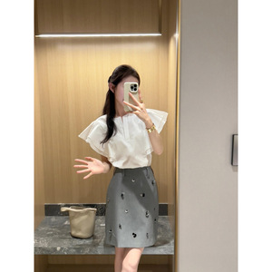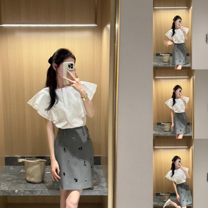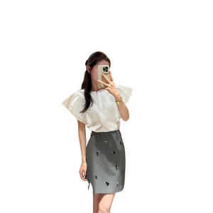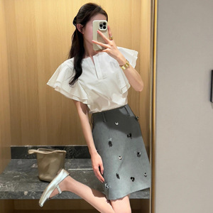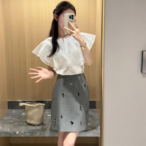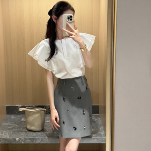 超人気の夏服、韓国風の高級白い小袖シャツとスカートのツーピーススーツのセットです。