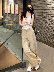 卡其色工装牛仔裤女夏季2025新款大码胖mm高腰宽松显瘦阔腿拖地裤