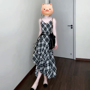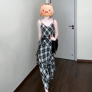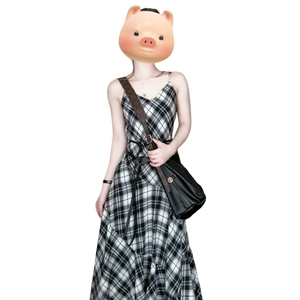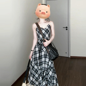 チェック柄サスペンダーVネックドレス婦人服2025新作初夏着用美しいウエストタイトロングスカート