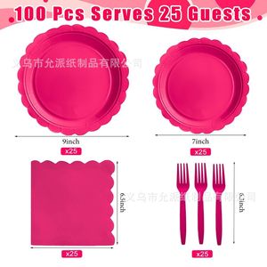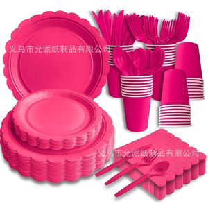 ピンクモノクロレース紙皿セット使い捨てディナープレートパーティーセット誕生日パーティーの装飾ナイフ、フォーク、スプーンシンプル