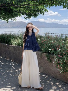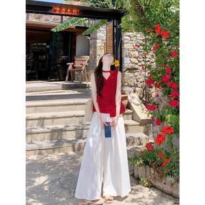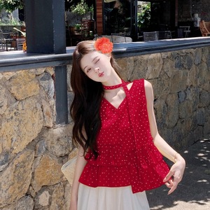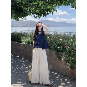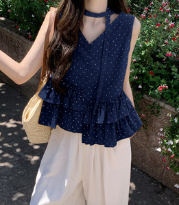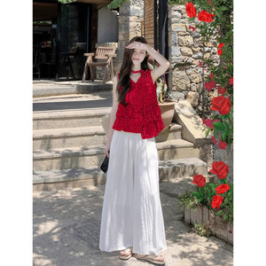 2025年夏の新デザイン、フリル付き、年齢軽減水玉模様のVネックシャツ、ワイドレッグカジュアルパンツ、女性用ツーピーストレンドセット