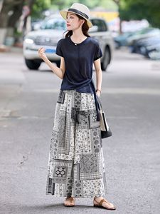 12025 夏の新作レディースレトロラウンドネック半袖 Tシャツ弾性ウエストプリントワイドレッグパンツ 2 点セット RX9249