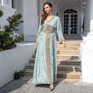中東ドバイドレス V ネックボトムスクラッチホットスタンピングエスニックスタイルの女性のスリムでルーズなエジプト女性のローブ