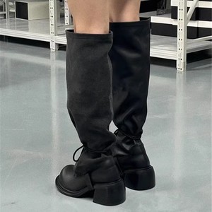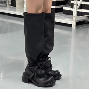 2025秋冬新作太ヒールハイヒールブーツ、ストラップ付き、スリム、太い筒周り、黒ブーツ、ロングチューブナイトファッションブーツ