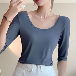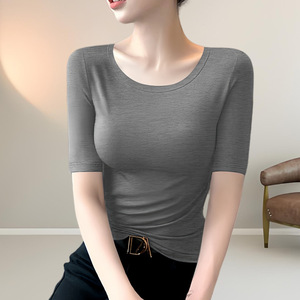 ブラックモーダルミッドスリーブTシャツレディース半袖春夏薄手ローネックスリムフィット五分袖ボトムインナートップ