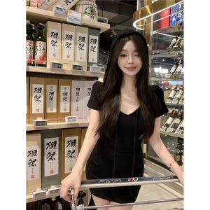 ヨーロッパとアメリカのウエスト露出ホットガールの新しい中空夏フード付きデザイン半袖スカートスリムウエスト痩身ドレス