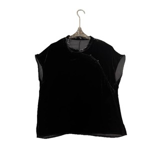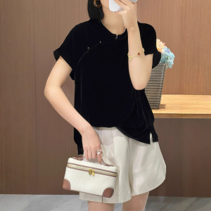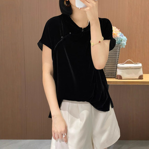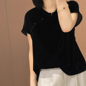新中式国风真丝丝绒连肩袖上衣夏季新款高端洋气显瘦圆领短袖小衫