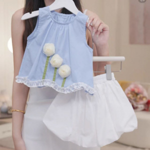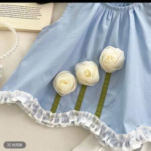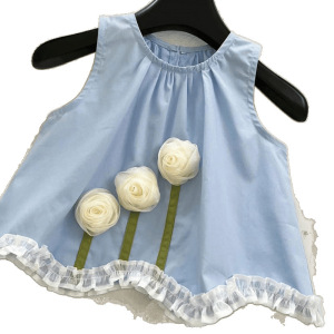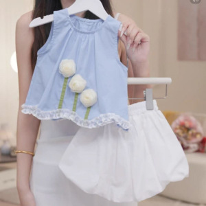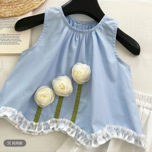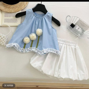 女の赤ちゃんの夏服 2025 子供の新しい韓国スタイルの花ノースリーブベスト子供のファッショナブルな花のつぼみショーツのセット