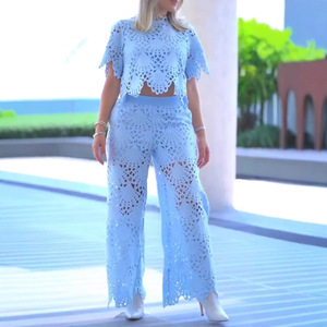 2025 アマゾンレディース新フレンチデザインファッションカジュアル中空レーストップワイドレッグパンツスーツ