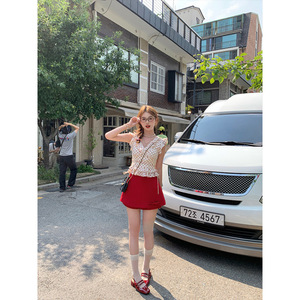 クリームアプリコット水玉トップ+レッドスカート高画質版