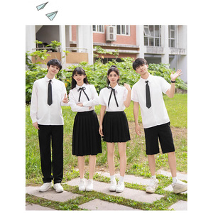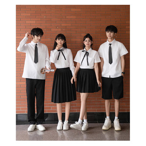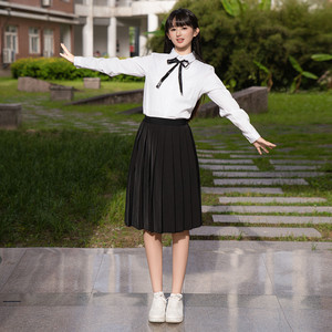 女性半袖白シャツ+黒プリーツスカート+黒リボン