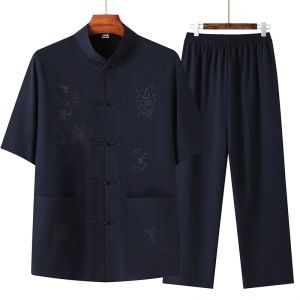 唐装メンズ中高年スーツおじいちゃん夏中国風お父さんスーツカジュアルルーズ薄手半袖漢服
