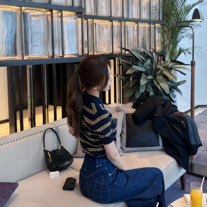 MIU シリーズ 深セン南友 25 サマーレター ジャガード ストライプ ラペル ニット 半袖