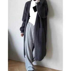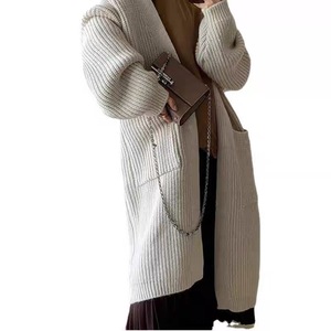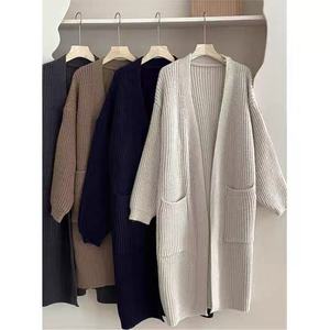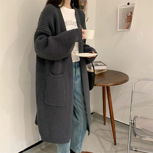 韓国風の快適な大きなポケット厚いウールの膝丈グレーミッドレングスセータージャケット女性のための春と秋の暖かいカーディガン