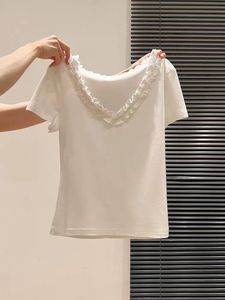 純綿フレンチ V ネックレースステッチ白半袖 T シャツ女性のための夏 2025 新しいスリムフィットホットガールトップ