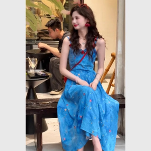 在庫あり海辺の休暇ブルー花柄サスペンダードレス女性のライトラグジュアリー夏ドーパミン見栄えの良いスカート