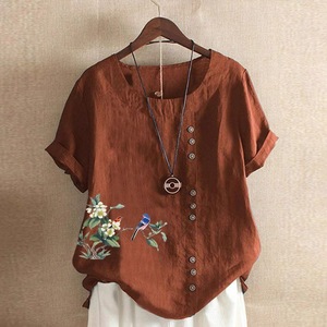 綿麻半袖Tシャツ夏ゆったり大きいサイズ婦人服レトロスタイルプリントボタンシャツシャツトップTシャツ