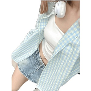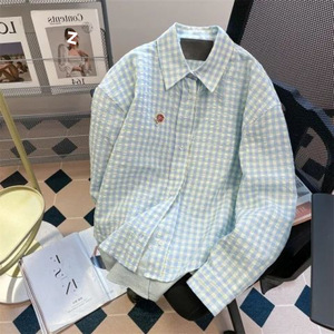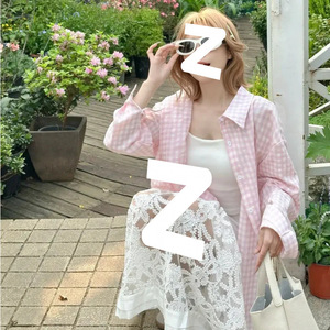 韓国偽ツーピースピンクチェック柄シャツ長袖ジャケットスプライシング春ルーズ新デザインカジュアルトップ