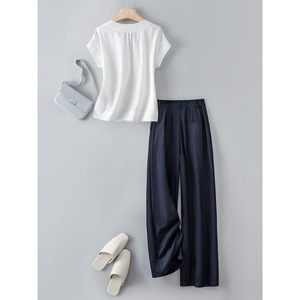 夏の韓国風リラックス高級スーツレディース万能Vネック半袖ハイウエストスリムワイドレッグカジュアルパンツ2点セット
