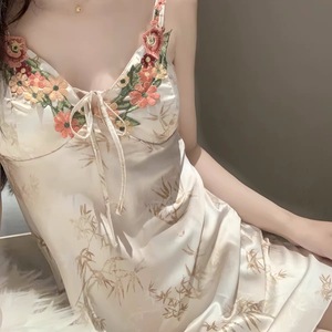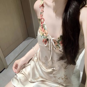中国風花サスペンダーアイスシルクナイトガウン女性の夏 2025 新しいハイエンドパジャマ胸パッド付きホームウェア