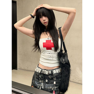 アメリカンホットガールスタイル赤と白のコントラストプリントチューブトップ女性の夏の新しいスリムフィットショートノースリーブトップ