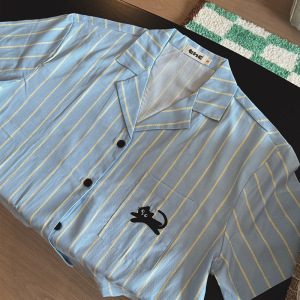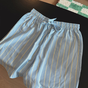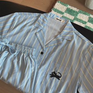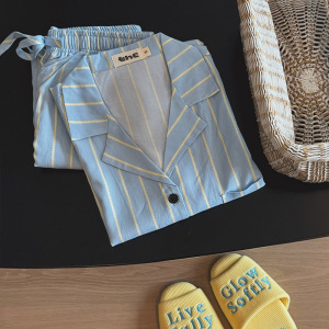 Yejia 同じスタイル 2025 ブルーストライプテンセルパジャマカップル夏半袖ショーツスーツ長袖ズボンホーム服