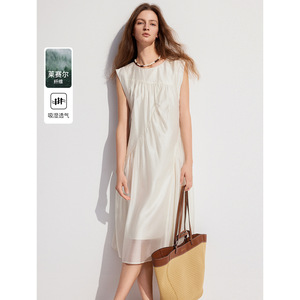 Eシリーズフレンチリヨセルドレスレディース2025夏新作気質ラウンドネックオフホワイトノースリーブスカート