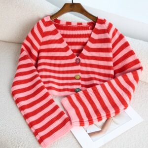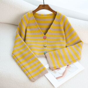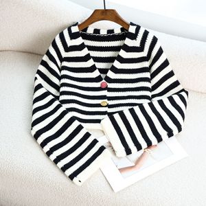 レトロストライプクロップトップ女性のための 2025 秋と冬香港スタイルルーズ長袖 V ネックカーディガンニットセータージャケット