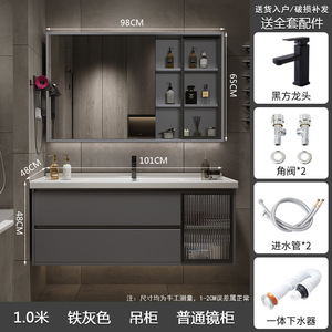 アイアングレーガラスドア普通ミラーキャビネット+ウォールキャビネット+フラット洗面器-1m [ハードウェアアクセサリーの無料フルセット。]
