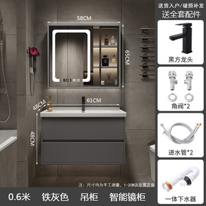 アイアングレーガラスドアスマートミラーキャビネット+ウォールキャビネット+フラット洗面器-60cm [ハードウェアアクセサリーのフルセットが付属しています。]